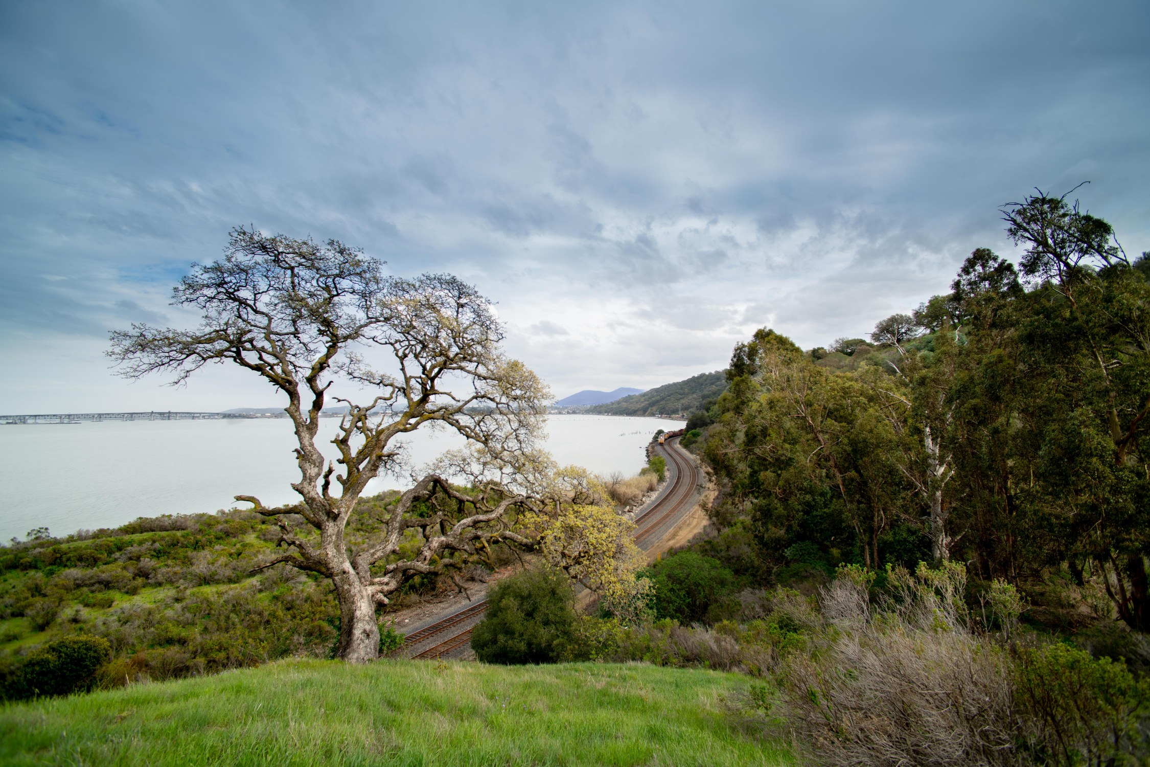 After walking through a creek bed of poison oak, which took a half an hour, i was losing valuable time. Not one limb touched me, but i was losing the light and when I finally came out on the hillside the view I had imagined in my dream with the train tracks and the mountain in the rear ground and the oak tree was just like my dream only it wasn’t a dream, it was the George Miller Trail. The only difference was the light, I could barely see the mountain through the haze, and the mountain, even in the distance, has a presence. I make a vow to get this shot on a clear day. For now, ‘trains a comin’ and I’m down to the shore – George Miller #6